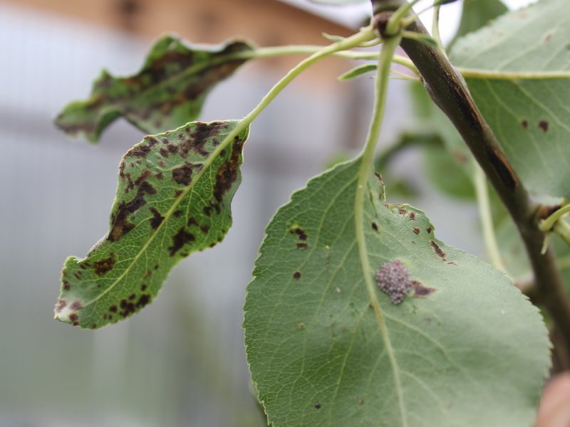 - Кафявите петна по листата могат да показват гъбична патология, наречена краста. Инфекцията се разпространява бързо в целия сайт, така че трябва да се справи спешно. Като лечение се използват фунгициди, насажденията се пръскат веднъж на две седмици.