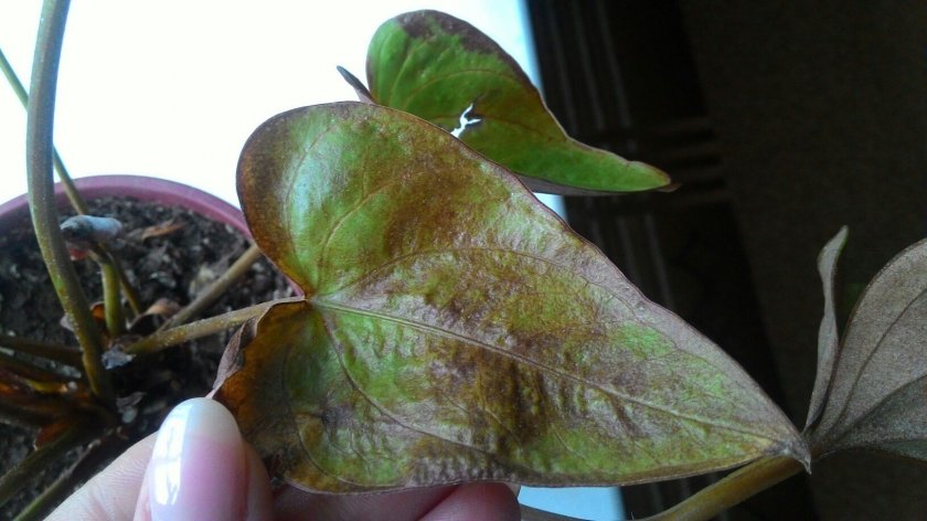 Сред болестите по листата на антуриума има и тяхното влажно потъмняване. Основната причина е неправилното поливане. Не трябва да се използва студена вода от чешмата за овлажняване на земята.