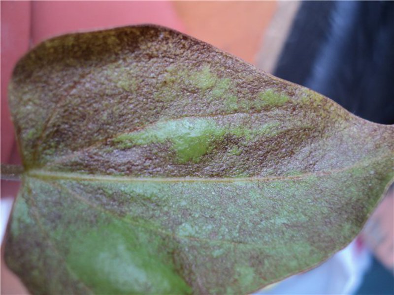 Жълто-зелените подутини и пръстеновидното пожълтяване са резултат от ниски температури, съчетани с висока влажност. Ако забравите за редовното хранене на антуриум, растението няма да има силата да устои на едра шарка, ще отнеме много време, за да съживи културата.