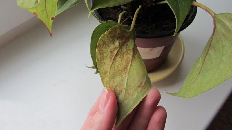 Паяковите акари издават малки жълти петна от външната страна на листата, сливайки се в огромни петна. В долната част на листа се появява паяжина, пълна с малки насекоми. Акарите обичат топлината и сухия въздух. Веднага след като цветето пожълтява, важно е спешно да третирате листата със сапунена вода, да премахнете насекомите и да избършете с минерално масло. Регулирайте режима на влажност и температура.