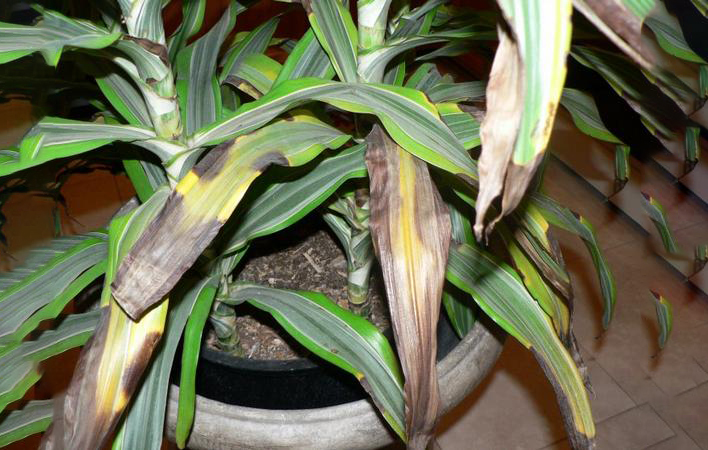 Ако се открие някой от изброените симптоми, се препоръчва да се коригира технологията за напояване. Ако почвата изсъхне твърде много, върховете на листата ще се набръчкат и ще имат кафяви върхове и петна. Драцената от болест, която не се лекува дълго време, в крайна сметка умира.