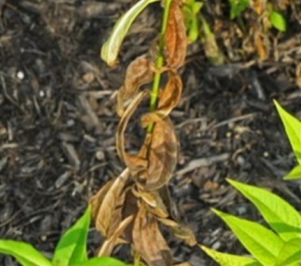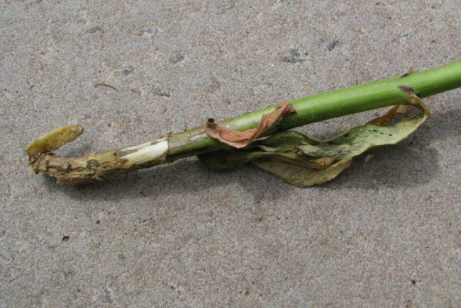 Резултатът е изсъхване на листата и напукване на долната зона на стъблата. Тъканите на стъблата са изложени и втвърдени. При достатъчен запас от хранителни вещества и влага в почвата, растението страда от липсата им. Най-често това се случва в периода на активен вегетационен период - засилен растеж на зелена маса от цветя.