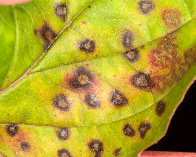 Проявява се в образуването на червени петна по листата, бързо нарастващи по размер. След известно време следите стават бледи. Листата изсъхва, пожълтява и в крайна сметка пада.