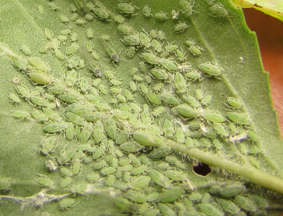 Листните въшки атакуват долната страна на листата. Те постепенно избледняват, придобивайки жълтеникав оттенък.
