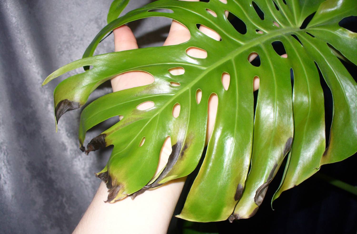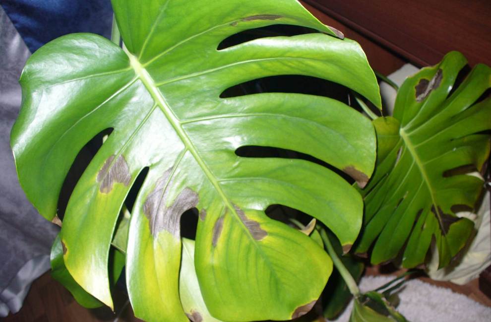 Заедно с жълтите петна често се появяват и кафяви петна. Защо листата на монстера почерняват, какво да правя в този случай? Въпросът тук е и липсата на влага. Необходимо е да се осигури на растението редовно поливане с достатъчно вода. За бързо възстановяване се използва пръскане на листа.