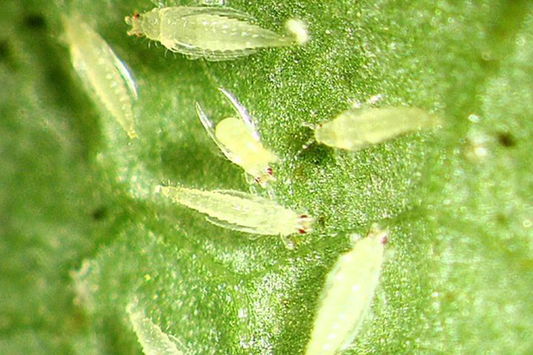 Трипсът са малки насекоми с дължина до 1,5 мм с удължено тяло. Поради тези вредители на повърхността на листата се появяват жълти петна. С течение на времето листът изсъхва и умира.