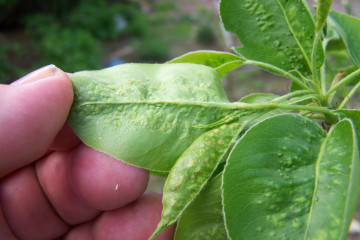Малко количество червено-оранжеви петна, т.нар. Трябва да се каже, че ако не са взети мерки за лечение на разсада, не само листата, кората на дървото, но и плодовете му могат да бъдат засегнати от ръжда. Фазовото развитие на заболяването е както следва: