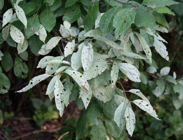 Когато възникне заболяване, издънките, листата, пъпките и съцветията са покрити с мръснобял прахообразен цвят, който става кафяв и се превръща в черни петна. След това растежът на леторастите спира, листата изсъхват и падат. Заразените съцветия не дават плод. На засегнатите плодове болестта се проявява под формата на мрежа. Патогенът хибернира в бъбреците, разпространявайки се чрез спори.