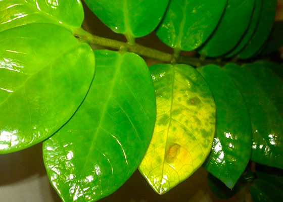 При Zamioculcas - листата пожълтяват, причиняват, болести