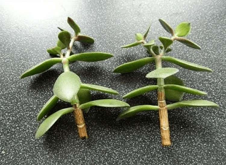 От изрязания изрез се отстраняват долните листа, тъй като на тяхно място ще се образува корен. В случай, че на издънката вече има въздушни корени, процесът на вкореняване ще протече много по-бързо. Резниците се обработват със стимулатор за вкореняване и се поставят в купа с вода.Водата в чашата се сменя от време на време. След няколко седмици в процеса на дебелата жена се появяват корени.