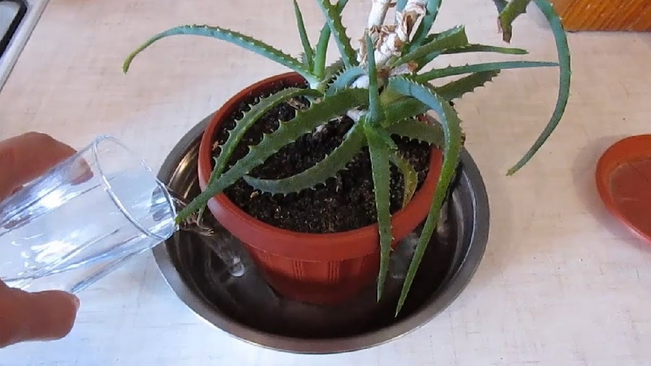 Някои любители на растенията просто потапят саксията с алое в подходящ по размер съд, напълнен с вода. Самата процедура отнема няколко минути, след което се оставя да се отцеди излишната влага и сукулентът се връща на мястото си. Това се прави, ако по време на засаждането е направен голям дренажен слой.