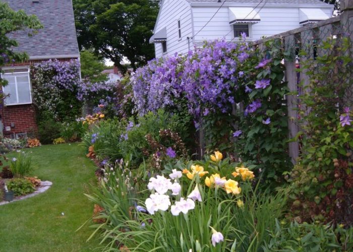 Клематис обича слънцето, а кореновата система расте добре на сянка. Поради тези причини до лианата се засаждат закърнели цветя или декоративни тревисти растения.