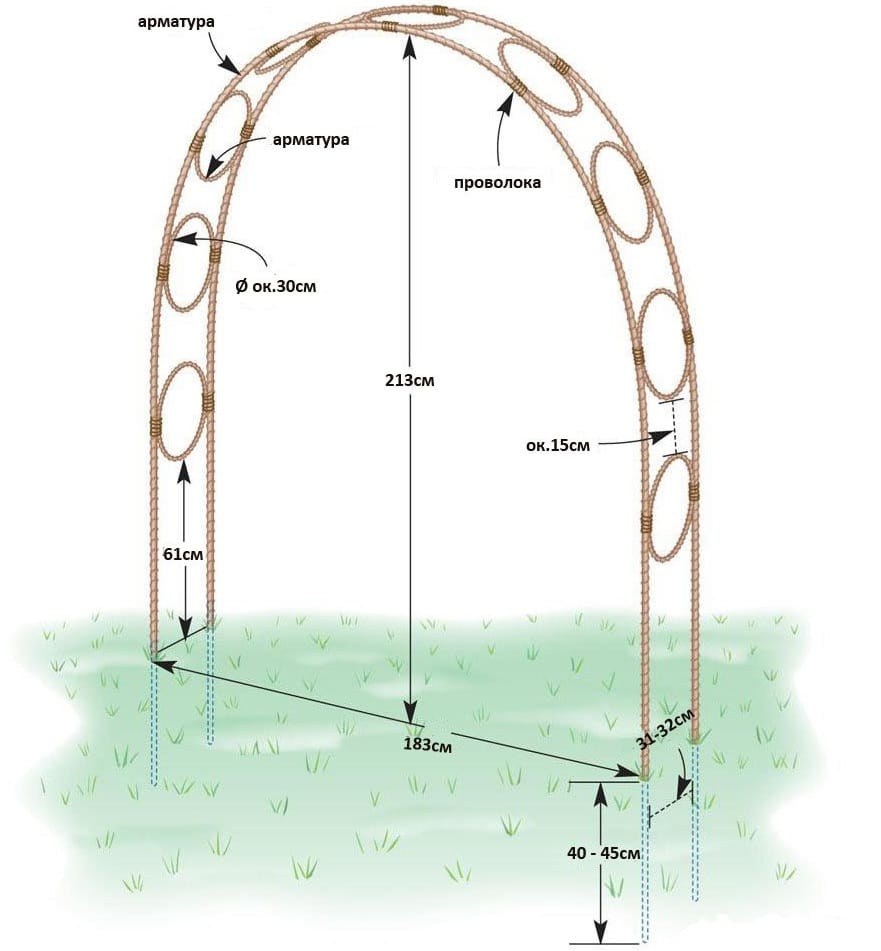 Най-простият вариант е армировъчна арка. Състои се от две извити метални пръчки. Пръстените между тях са закопчалки. Не е необходима машина за заваряване.