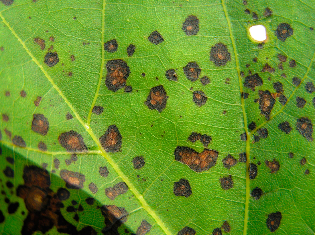 - На обратната страна на листната плоча се образуват малки язви под петна;