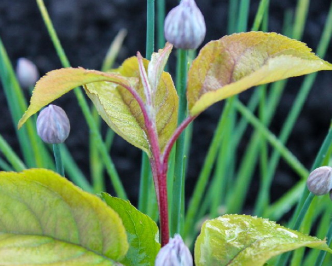 Маята като подхранване се използва за пръскане върху листа 2-3 пъти през пролетно-летния сезон. Първата листна превръзка се извършва преди началото на пъпките. Разтворът се приготвя от 100 g жива мая, която се разтваря в 1 литър топла вода. Настоявайте за 5-6 часа. Добавете още 14 литра чиста вода, филтрирайте и напръскайте стъблата и листата.
