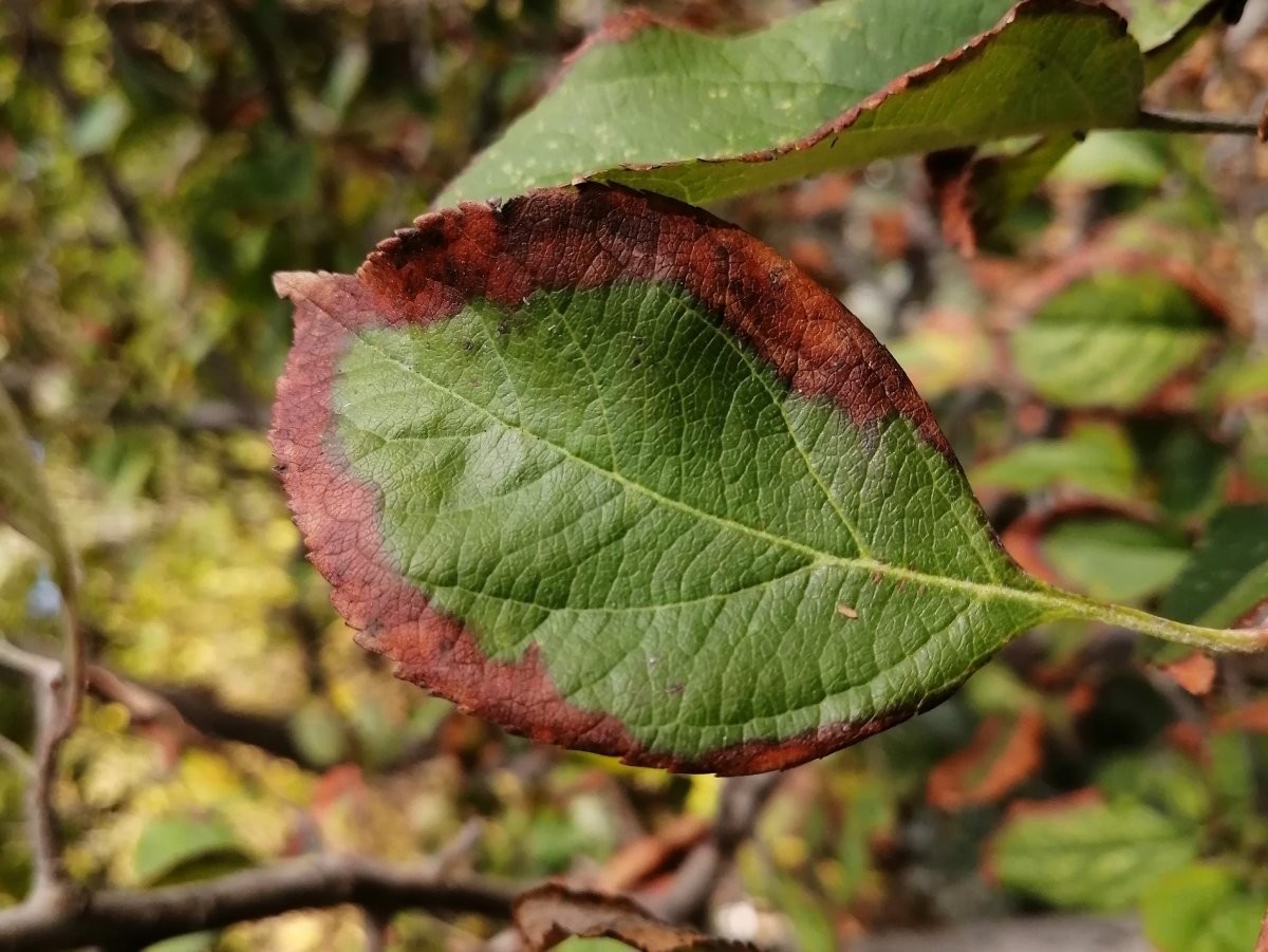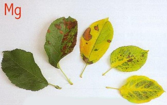 - липса на магнезий - листата пожълтяват, падат рано, могат да останат зелени между вените, понякога се появяват хаотични кафяви петна;