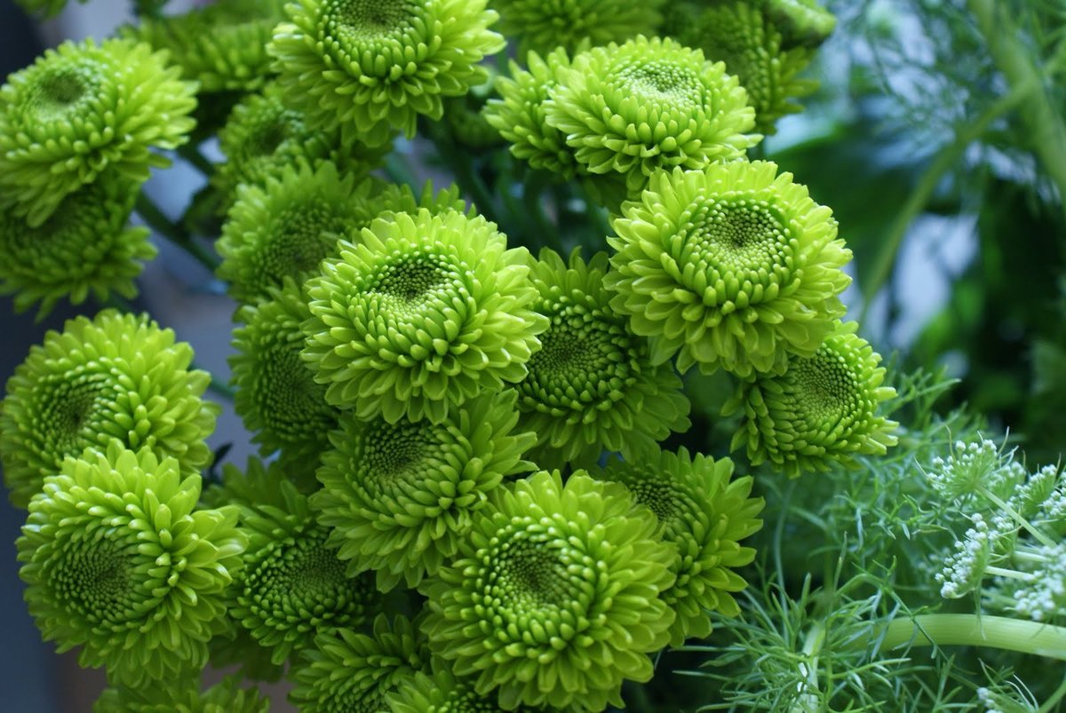 Хризантема Code Green, отгледана от холандски животновъди, има помпонови съцветия с малахитов цвят. Храстът ще нарасне до 70 см височина и може да издържи до 3 седмици нарязан.