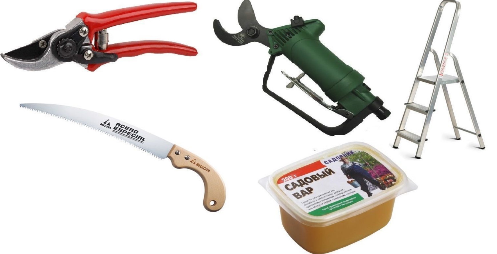 - Трион. Основен инструмент за премахване на големи клони.