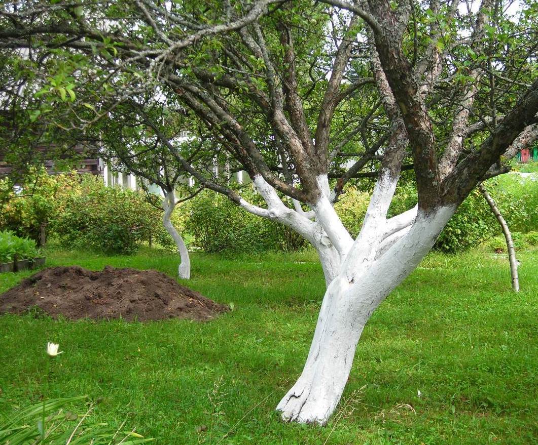 - Почистете короната. Побелете багажника и скелетните клони с вар, смесена с PVA лепило (по този начин варосването трае по-дълго).