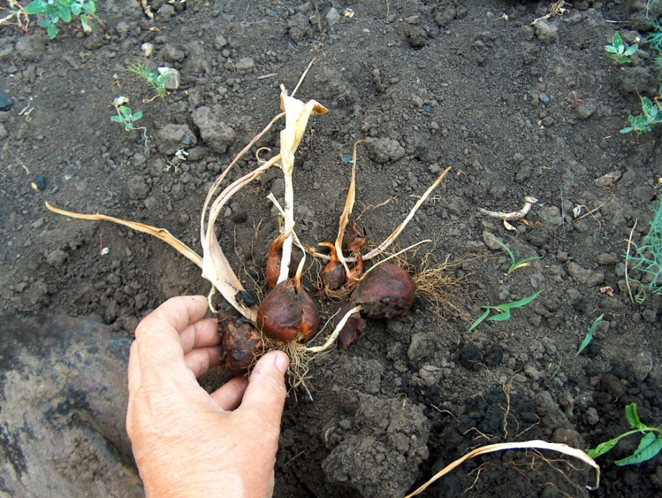 След изкопаването основната задача е да се запазят луковиците. Ако са били изкопани от влажна пръст, първо трябва да се изплакнат в хладка вода, след това да се изсушат, например, в мрежи, окачени на сухо място.