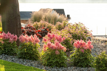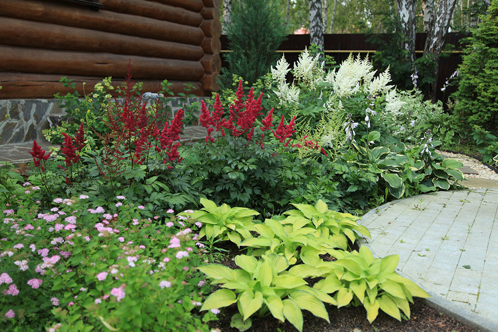 Такива цветни лехи са уникални: ярко цъфтящата астилба и буйната розетка на домакините се допълват перфектно. След като приземите тази комбинация в тъмен ъгъл, можете да я украсите изгодно.