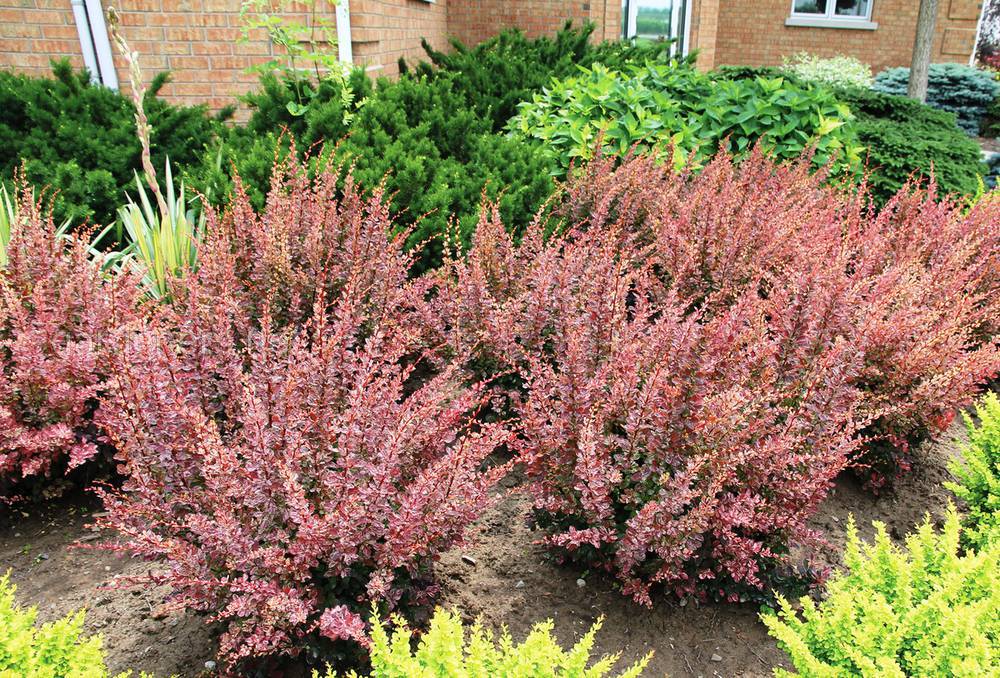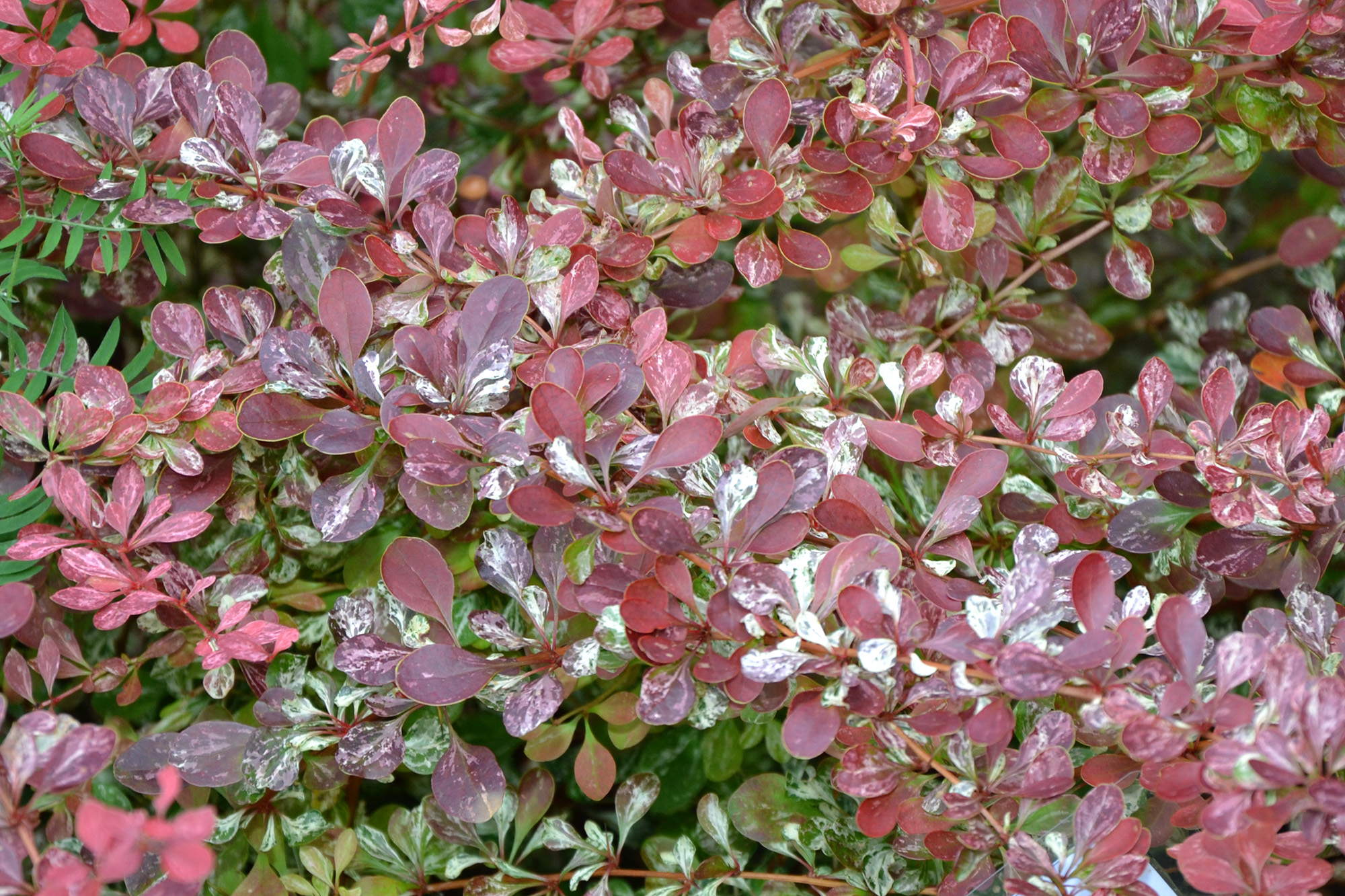 При озеленяването най-често като основно растение на композицията се използва берберис Тунберг (berberis Thunbergii Rose Glow). Ярко лилавият цвят на листата на многогодишните му издънки се разрежда с течение на времето с пъстра палитра от млади клони. Плискащите петна контрастират перфектно с добре дефинираните розови и бели линии по листата.