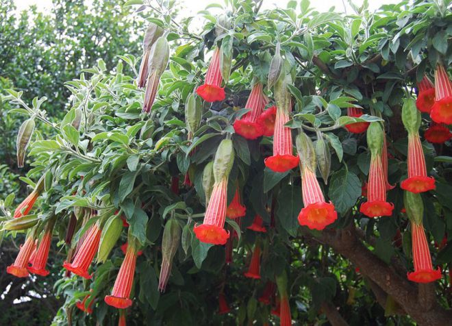 - Brugmansia suaveolens или ароматна бругмансия може да цъфти през цялата година при определени климатични условия. Този вид растение има бразилски корени. Brugmansia розово в дивата природа достига 5 м височина. Цветовете са бели или млечнозелени.