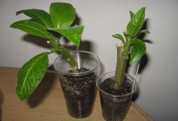 Разрешава се резниците да размножават бругмансия, която е на възраст поне една година. Тази процедура може да се извършва 2 пъти годишно: в началото на есента и в началото на пролетта. Повечето градинари предпочитат да режат растението през пролетта, вярвайки, че кореновата система се развива по-бързо през този период. Колко е времето за засаждане на бругмансия през пролетта? Можете да започнете да правите това от средата на март. Този метод е по-лесен от предишния. Освен това храст или дърво, размножаващо се чрез резници, се развива по-бързо, съответно цъфти по-бързо.
