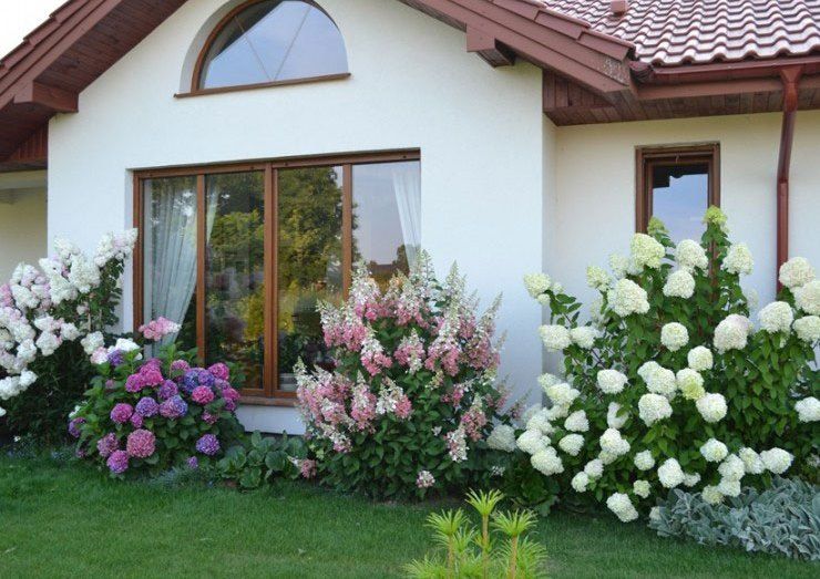 Цветните лехи, разположени в централната или предната част на задната част на двора, се препоръчват да се оформят въз основа на високи видове хортензия. Буйни, разпръснати храсти перфектно ще запълнят празното пространство, правейки го уютно.