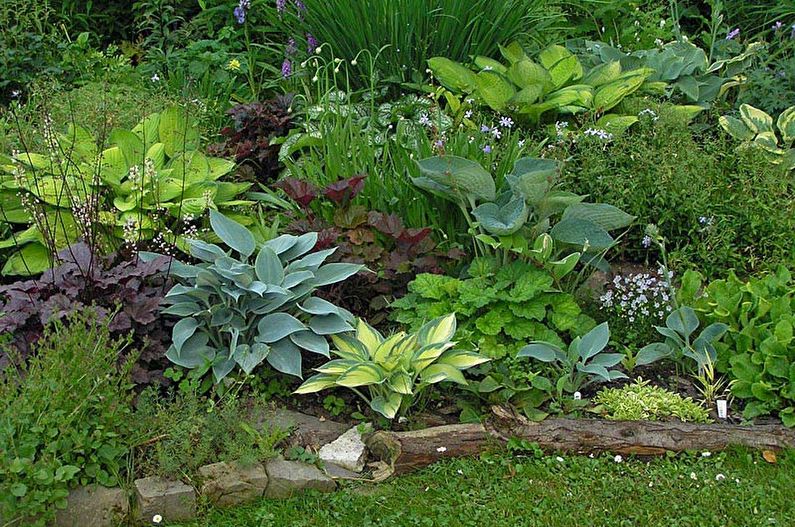 - Цветно легло с флокси, гейхери и домакини. Умела комбинация от Heuchera и Hosta с привличаща вниманието вариация в нюансите на едното и другото цвете трансформира сайта, било то цветно легло, морава или алпийска пързалка, и привлича вниманието. И двете цветя са непретенциозни в грижите, устойчиви на болести, измръзване и сухо време. Градинските ъгли, украсени с Heuchera и Hosta, са истински акцент в дизайна. В полусенчеста зона на градината многогодишните флокси ще изглеждат като светло петно, цъфтящо почти през цялото лято до средата на есента. Сухото лято, като зимните студове, не е толкова чувствително към флокса.