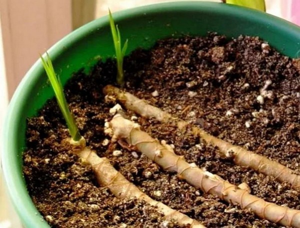 | Вертикален | Част от багажника се поставя в долния разрез в съд с вода. Можете също така да заровите дръжката в мокър пясък или вермикулит. След изчакване корените на нишките да поникнат в долната част на сегмента и достигнат 1 см, а отгоре се появява зелена издънка (и тя ще бъде единствената), разсадът се прехвърля в постоянна саксия |