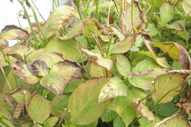 - Липса на обличане. Торове за хортензии се прилагат в корена, като се разтварят във вода. Липсата на хранителни вещества, особено през периода на цъфтеж, се отразява негативно на растежа на издънките и образуването на съцветия.