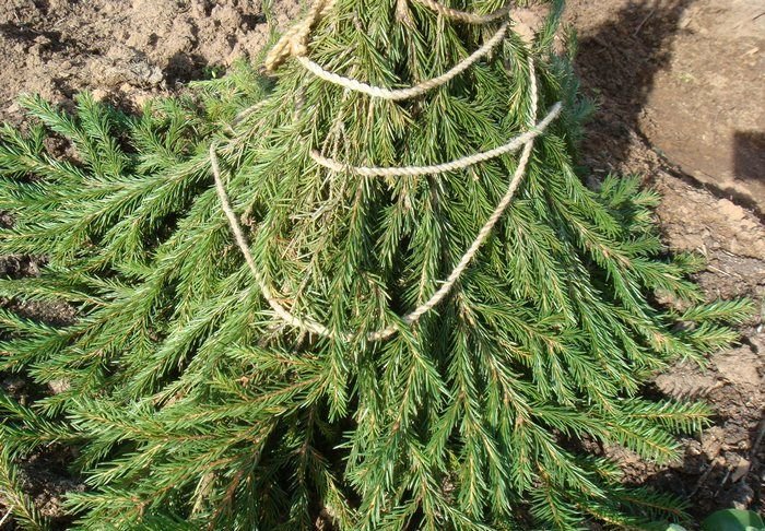 На върха на смърчовите клони трябва да се застраховате, като го покриете със спанбонд. Такъв спомагателен слой ще спаси растението от течения на студен въздух.