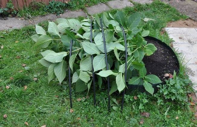 След подстригването можете да измислите всеки дизайн, който включва използването на агрофибър като спомагателен материал за фиксиране на основната изолация. Благодарение на този слой хортензията може да бъде запазена за развитие и цъфтеж през следващата година.