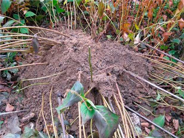 Тогава хълбочването на храста се извършва в рамките на стъблата. Това ще предпази кореновата система от замръзване, което означава, че растението ще запази основните си функции.