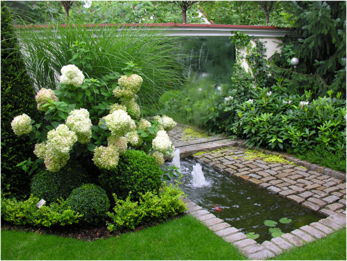 Съставът с хортензия в градината трябва да се комбинира с общата тема: дизайнът на къщата и зоната на задния двор. Популярни са няколко опции за дизайн: