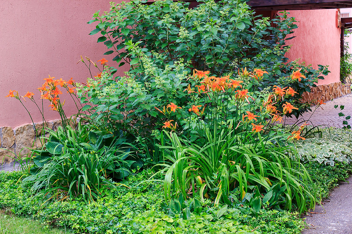 Ако има нужда да украсите ъгъл, където почти няма слънце, можете да опитате следващата версия на цветното легло. В центъра - хортензия от сорта Kiushu и лилейници (обикновена червена или Stela de Oro). По-нататък - нарцис късно цъфтящ, хоста Зиболид, горска теменужка, бръшлян и водосбор. Такъв състав винаги изглежда свеж и оригинален, практически не се нуждае от поддръжка.