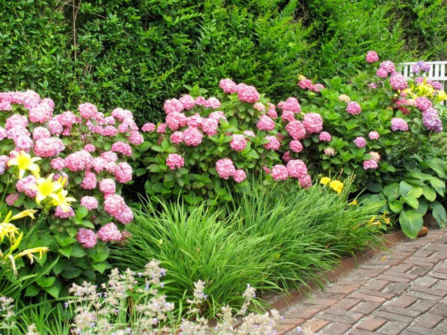 Цветна градина с хортензия винаги е ярка цветна композиция, която постоянно радва със свежи цветове, благодарение на непрекъснатия цъфтеж на хортензия през лятото и началото на есента.