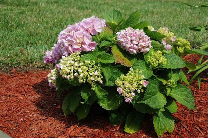Не можете да прехранвате цветето. При пресаждането на хортензии през пролетта на друго обогатено място не се изисква повече тор. Кореновите области са покрити с мека мулчировка от дървени стърготини, но те не позволяват на течността да застоява в дебелината си.