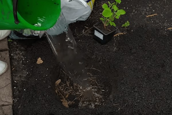 Храстът трябва да се потопи в земята, като погребе корените на нивото на почвата - не трябва да се зарива в земята или да се откроява като хълм.Растението, заедно с "родната" земна бучка, се премества в подготвената дупка, луменът се запълва с питателна почва, полива се обилно, но не се набива. 1 храст, в зависимост от размера му, ще отнеме 1-4 кофи вода.