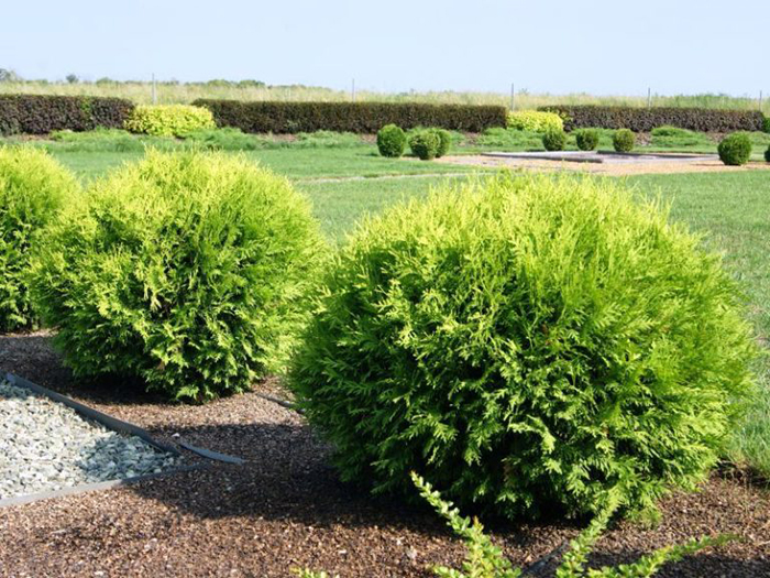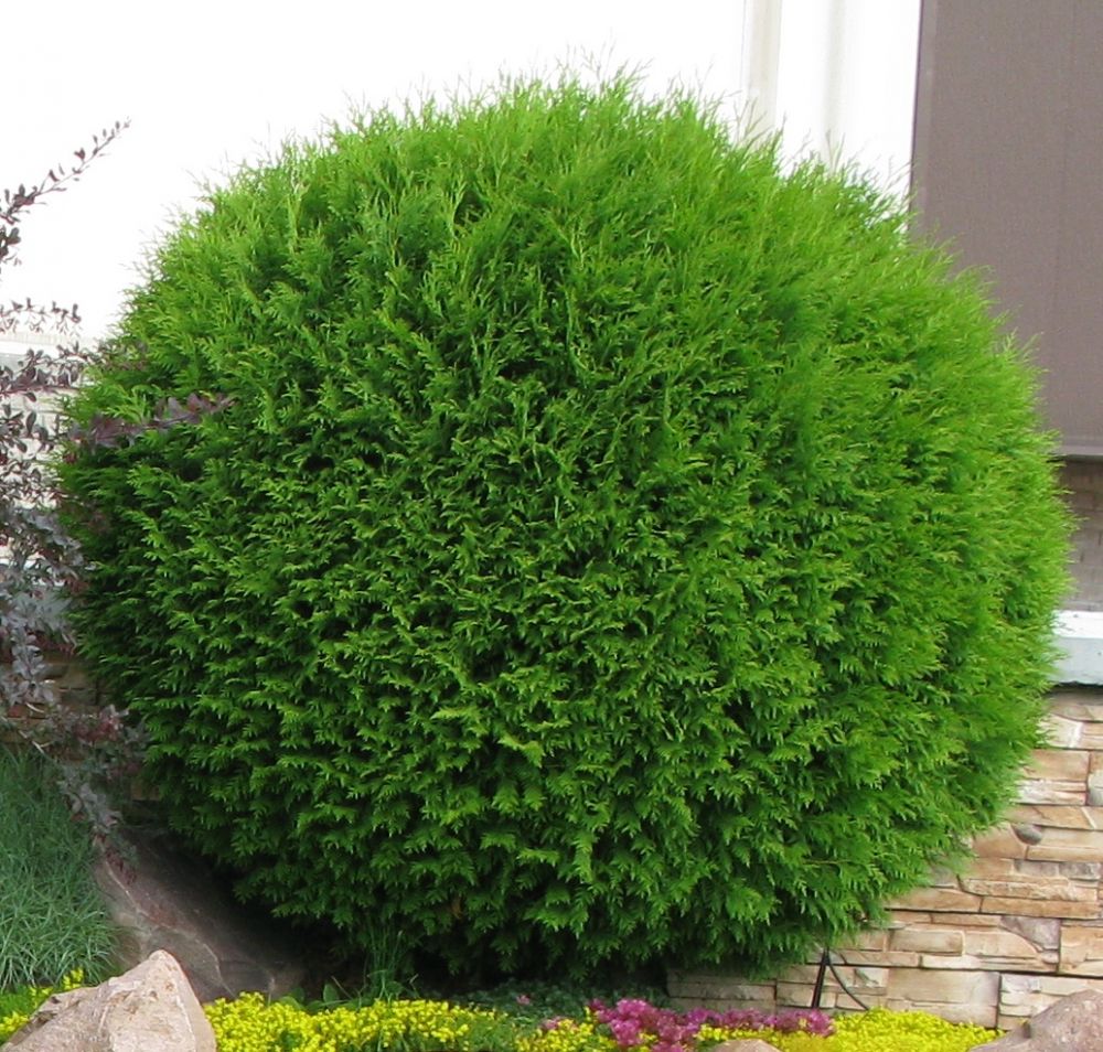 Декоративната западна туя, благодарение на своята сферична плътна корона, ще украси всяка градина. С помощта на изрязването можете да създавате всякакви фигури от него по ваша преценка. Много хора засаждат наблизо трънливия компактен смърч Glauka и туята Globoza - растенията са сходни по форма и, когато се редуват, създават удивителна композиция.