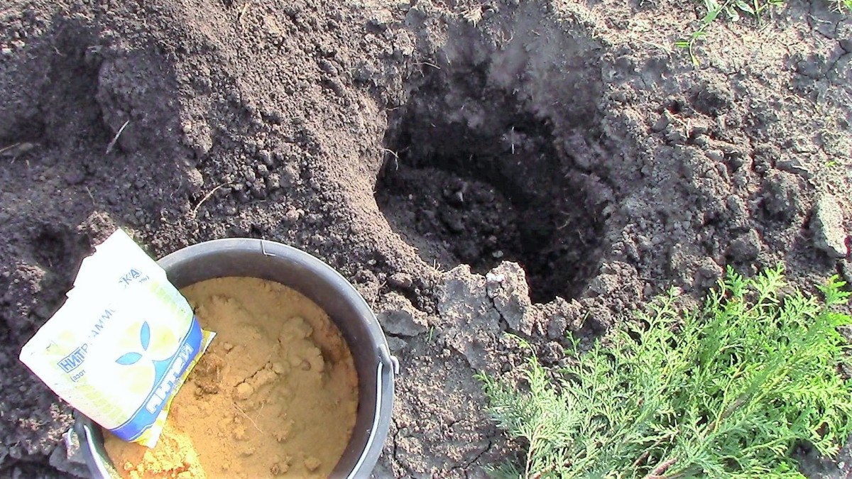 - Пригответе яма. Той трябва да е с 10 см по-голям от контейнера за туя. Стандартният размер за удобно отглеждане е 60 × 60 × 80 cm.