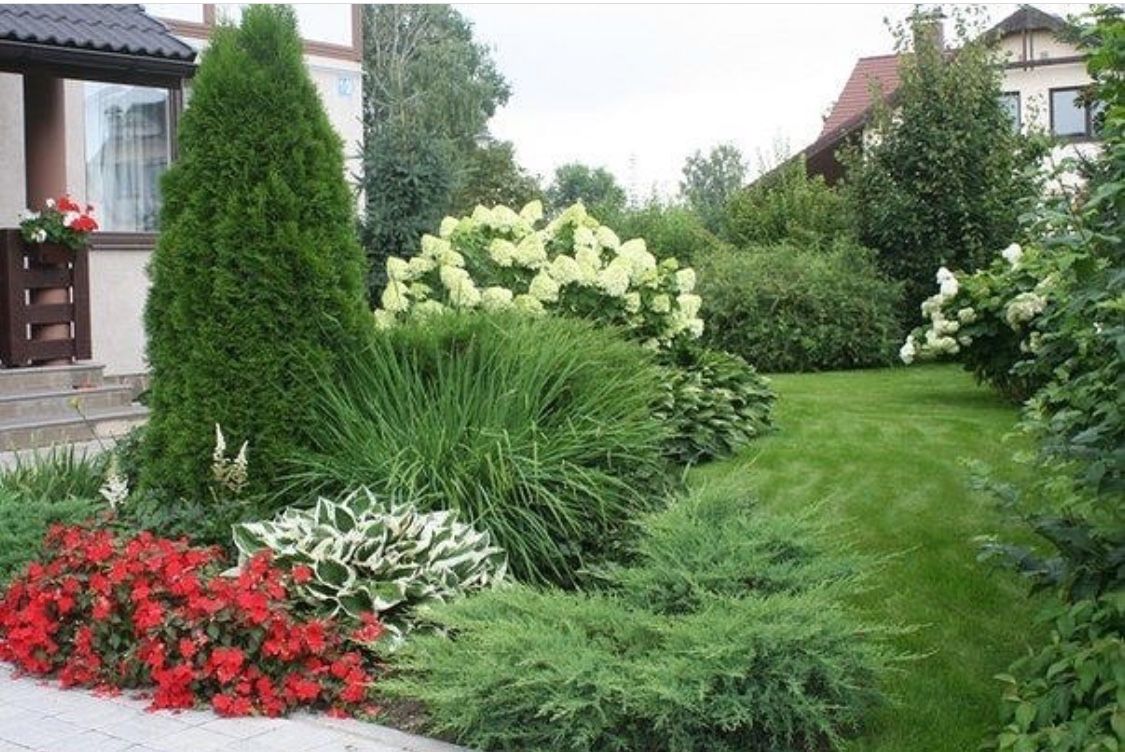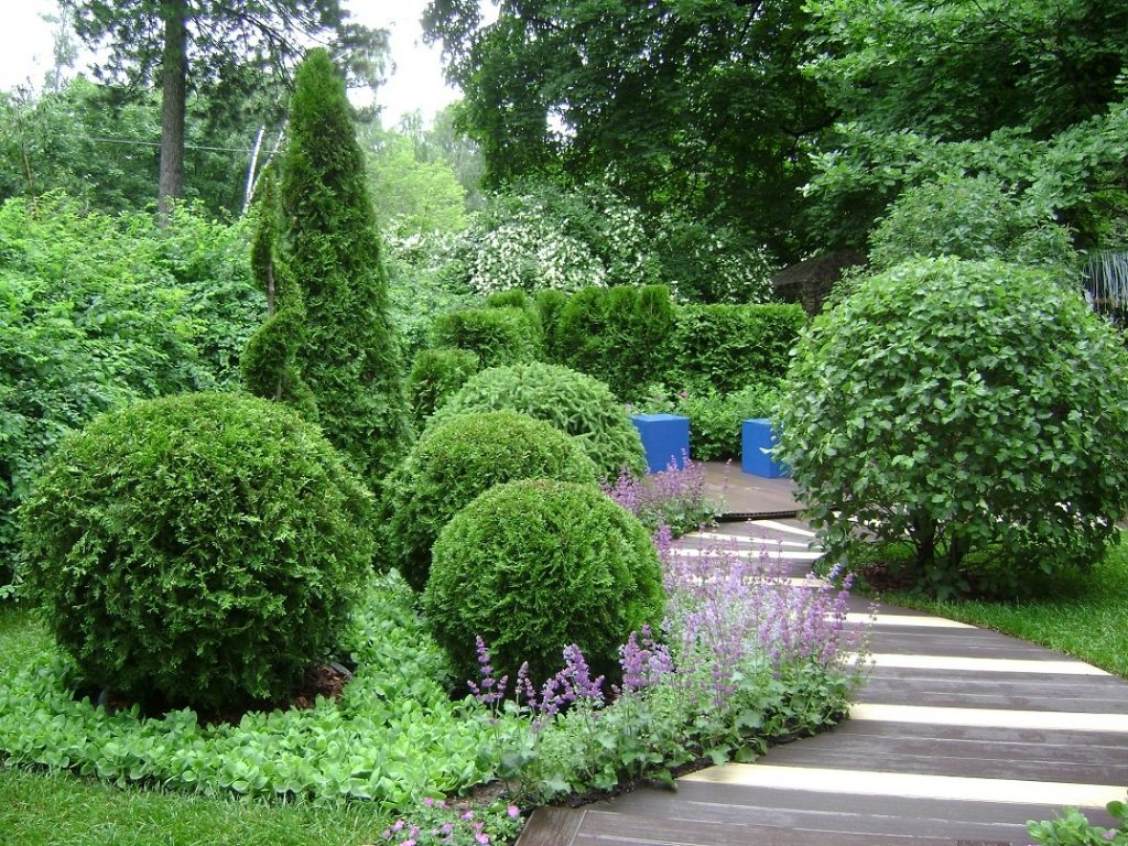 - Excelsa (Thuja Plicata Excelsa) е друг гигант за мащабни композиции. Височината на дървото достига 12 м, а ширината е 3-4 м. Сводестите клони образуват широка колонна форма на дървото. Лъскавата повърхност на тъмнозелените игли я отличава от останалите вечнозелени растения.