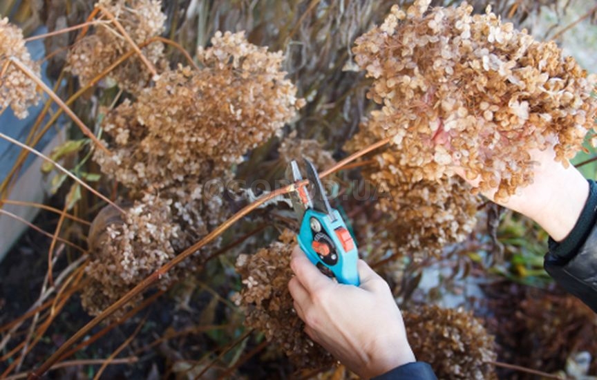 - Клоновете на хортензията на метлицата се изрязват на 1/3 от дължината. Плътната корона се изтънява, усуква се и се отстраняват слаби клони.