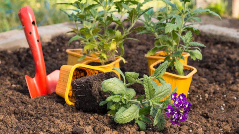 Вербената не обича стагнацията на влагата в корените, следователно, когато се трансплантира в открита земя, в дупките е подреден дренажен слой от експандирана глина или натрошен камък. В противен случай кореновата система ще изгние. За да се получат красиви и обемни храсти, растенията се трансплантират на 5-7 парчета. в една дупка с разстояние най-малко 30 см между тях.