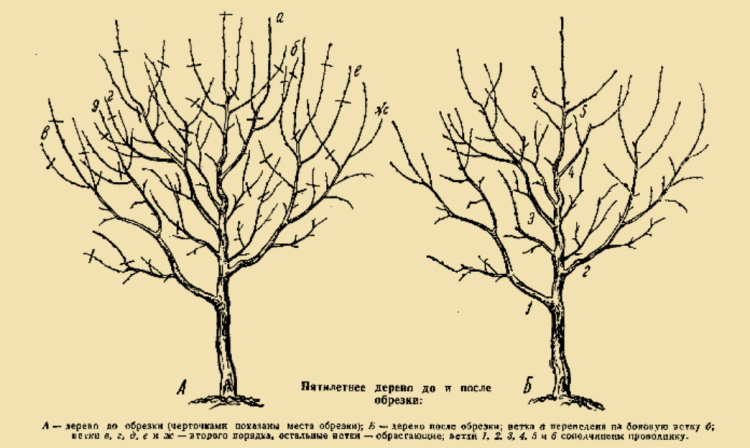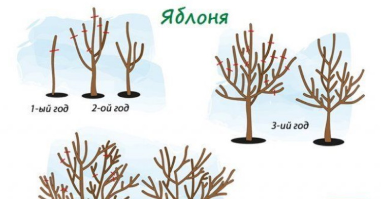 На едногодишна възраст се подрязват ябълка и круша, на ствола остават не повече от 6 пъпки, от които през следващата година ще порасне правилен, здрав издънка. На двугодишни разсад се оставят 5 млади клона, останалите се отстраняват.