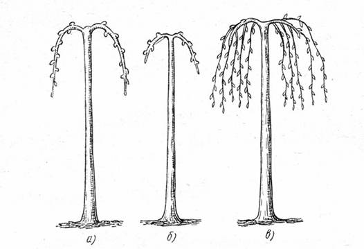 Пъпките се присаждат не нагоре, а надолу. Когато издънките започват да растат, те придобиват вид на дъга, като постепенно започват да приличат на плачеща върба, откъдето идва и името на всяко от дърветата.