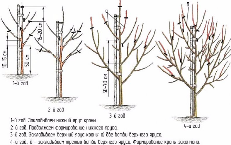Подрязването през втората и третата година от живота на дървото се извършва по същата схема. От страничните клони, които са вече на една година, започват да растат клони от втори ред. Издънките, растящи в пространството между нивата, се изрязват и пренасят в дърво. След полагане на скелетните клони се изисква да се отреже централният проводник, който също ще бъде прехвърлен към страничния клон.