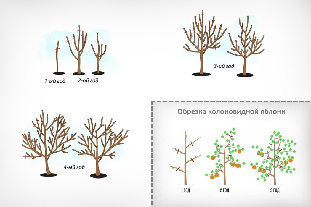 След зимуването градинарската култура се нуждае особено от грижи. Колонните ябълкови дървета се подрязват през пролетта по схемата: