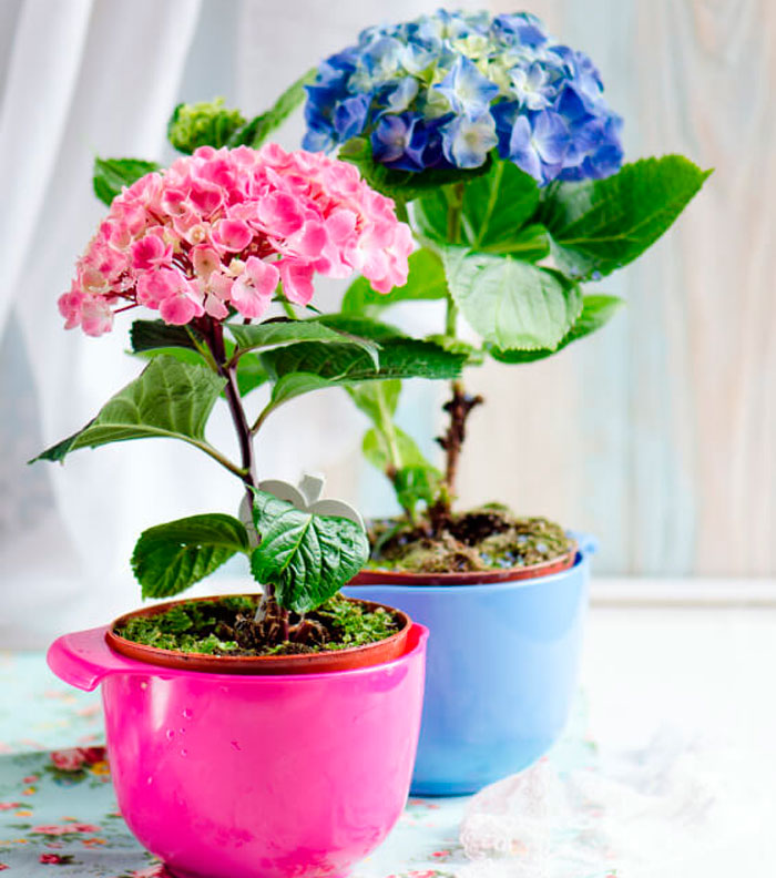 Също така, не задълбочавайте корените на растението твърде много, когато засаждате в саксия, използвайте съд с достатъчен размер, направен от глина или керамика. Хортензията няма да расте, докато не запълни цялата саксия с коренови издънки.